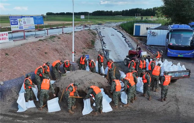 演练模拟嫩江堤防太山镇宝石村段穿堤道路突发险情。接到险情报告后,人武部立即启动防汛应急响应,迅速集结100名基干民兵,并同步协调市公安局、市交通局做好道路秩序维护和运输车辆调配。在险情处置阶段,参演人员依次开展装填沙袋、铺设无纺布、设置反滤围井、植桩等模拟抢险作业。演练过程紧张有序,各参演单位和人员严格按照预案要求,紧密配合、协同作战,出色完成了各项演练任务。