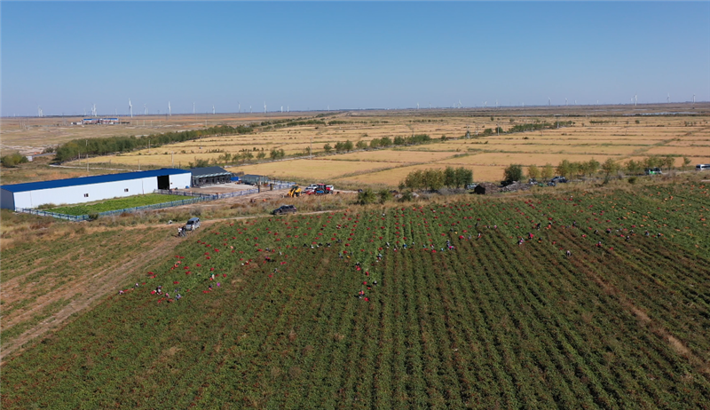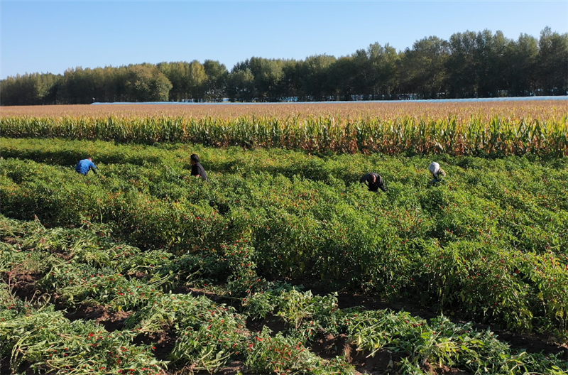 在红岗子乡马营子村,色泽饱满的辣椒挂满枝头,种植户们正在采收成熟的辣椒植株,为后续集中晾晒做好准备。在大岗子镇双岗山村,连片的辣椒田如同绿色的海洋,饱满的鲜辣椒在枝叶间若隐若现,尽显丰收喜悦。种植户们穿梭在田垄间,采摘、装袋、搬运上车,井然有序。热火朝天的劳动场景,构成了一幅生动的秋收画卷,也为村集体增收奏响了欢快的“椒”响曲。