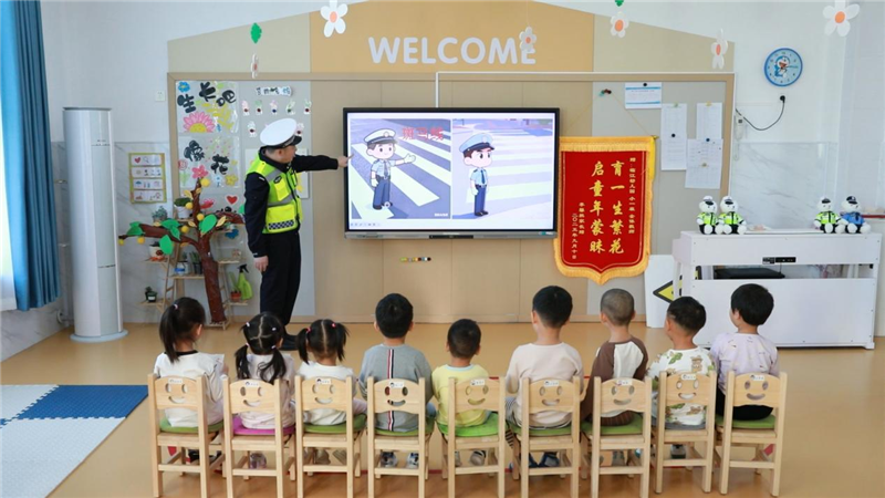 活动中,民警通过播放图文并茂的趣味课件以及动画短片的方式,向小朋友们讲解交通标志等交通安全常识。在有奖互动环节,民警围绕课件内容提出简单问题,并为答对问题的小朋友们送上警察小熊、毛绒玩偶等精美奖品,孩子们踊跃举手,争相抢答,现场气氛温馨而热烈。