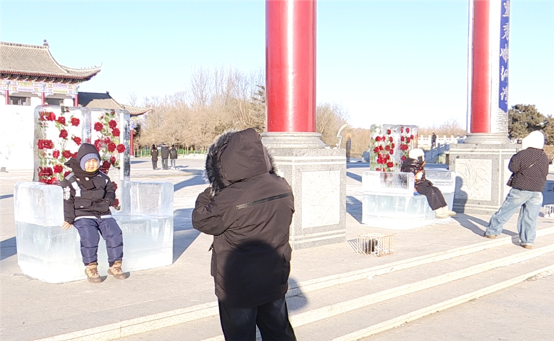 步入景区,冰雪世界的奇思妙想扑面而来。嫩西湖的创意冰雕展区内,艺术家以冰为纸、以刀为笔,“冰封玫瑰”晶莹细腻定格浪漫,“冰封鲜鱼”纹路逼真似欲破冰,将地域特色与艺术想象巧妙融合。铜镜广场上,庄重大气的5A标识冰雕与憨态可掬的马年贺岁冰雕相映成趣,传递新春期许。盛世捺钵广场的四代辽皇雪雕群栩栩如生,重现辽代捺钵文化风貌,让市民游客在赏景中感受深厚的人文底蕴,纷纷驻足打卡。此外,双翼岛还打造了2000平方米雾凇岛核心景观及百米雾凇景观带,银装素裹的奇景宛如冰雪童话世界。