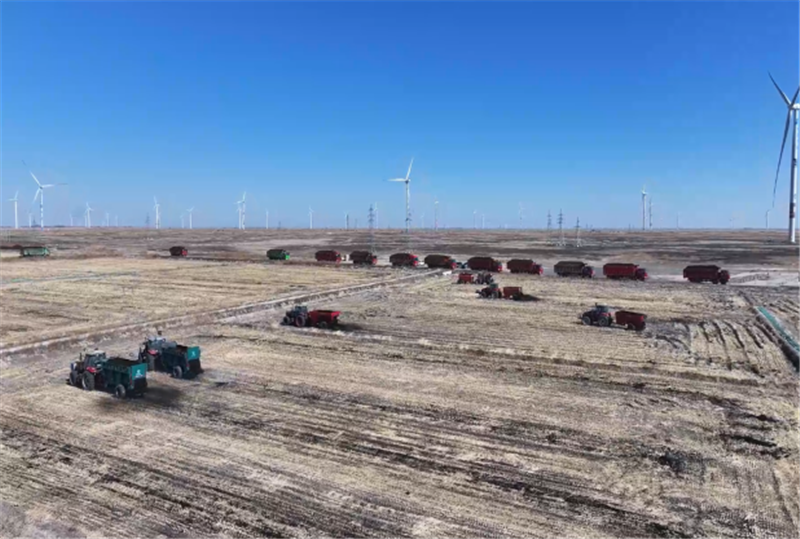 在项目现场,运肥车辆穿梭往返、精准卸料,大型抛撒机匀速行进、均匀布肥,卸肥、运肥、抛撒肥各环节衔接顺畅,机械化作业高效推进。