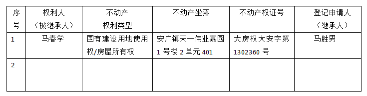 标 题: | 继承不动产登记公告(马胜男) | ||