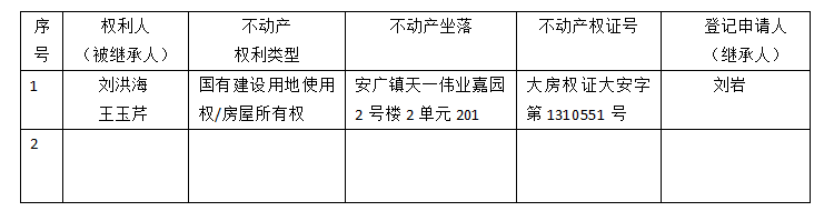 标 题: | 继承不动产登记公告(刘岩) | ||
