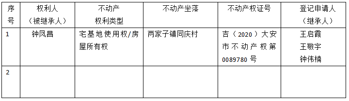 | 标 题: | 继承不动产登记公告(王启霞王敬宇钟伟楠) |