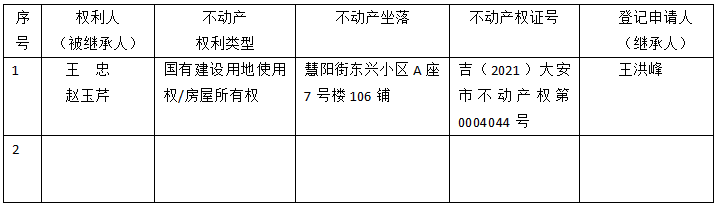 | 标 题: | 继承不动产登记公告(王洪峰) |