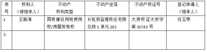 | 标 题: | 继承不动产登记公告(任玉琴) |