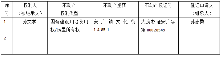 | 标 题: | 继承不动产登记公告(孙志勇) |