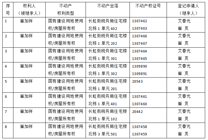 | 标 题: | 继承不动产登记公告(艾春光崔爽) |