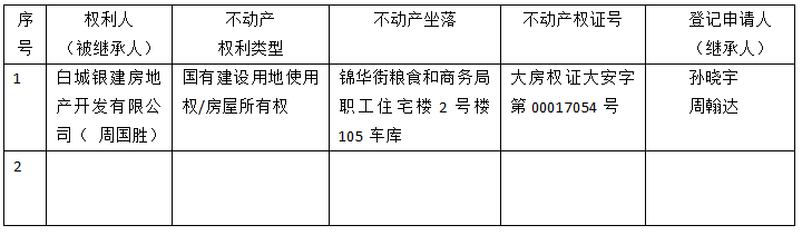 | 标 题: | 继承不动产登记公告(孙晓宇周翰达) |