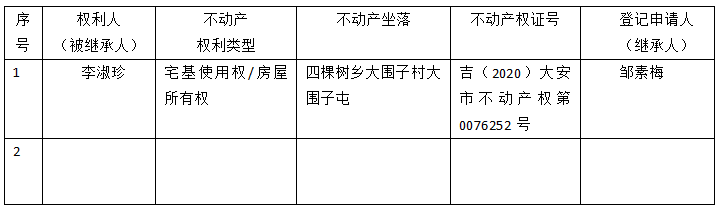 | 标 题: | 继承不动产登记公告(邹素梅) |