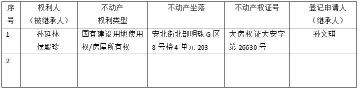 | 标 题: | 继承不动产登记公告(孙文琪) |