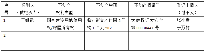 | 标 题: | 继承不动产登记公告(张小雪于万竹) |