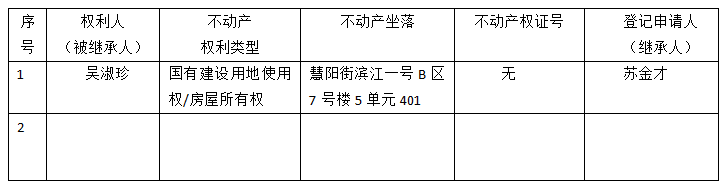| 标 题: | 继承不动产登记公告(苏金才) |