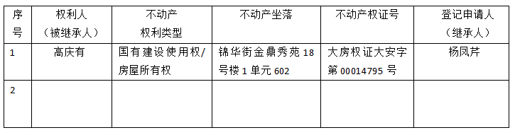 | 标 题: | 继承不动产登记公告(杨凤芹) |