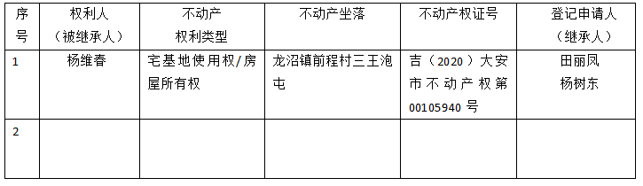 | 标 题: | 继承不动产登记公告(田丽凤杨树东) |