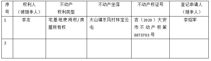| 标 题: | 继承不动产登记公告(李绍军) |