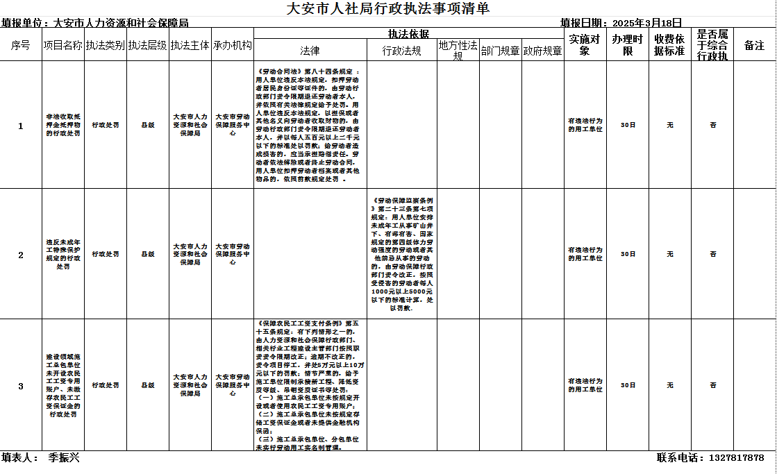 | 标 题: | 大安市人社局行政执法事项清单 |