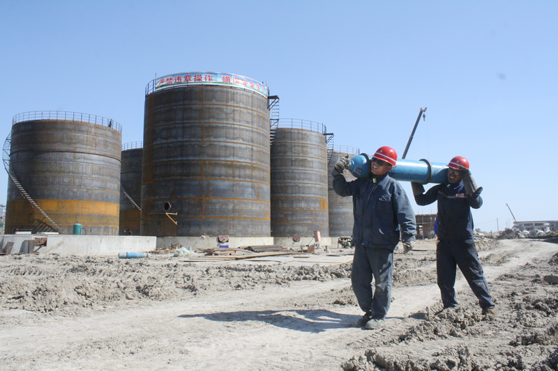 繁忙的建筑工地上汇聚了来自五湖四海的建设者。连日来,尽管气温持续升高,但无论是哪个工种、几号工地,工人们仍在烈日下抢抓工期,园区在他们的努力和辛勤付出中逐渐成型。记者在施工现场看到,十几个硕大的储罐已经高高矗立,罐区设备主体基本完成,罐内的内浮盘以及相应的设备及管道已经陆续进行安装。